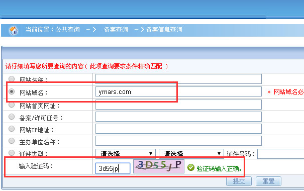 第四步,我們在右側輸入我們要查詢的網站(zhàn)和(hé)驗證碼(這裏我們以征帆網絡網址"ymars.com"為(wèi)例,給大(dà)家(jiā)說明(míng))